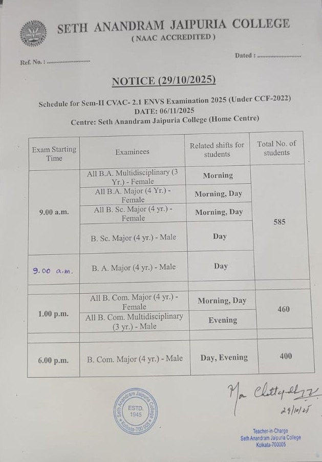 Notice regarding schedule for sem 2 CVAC-2.1 ENVS (06/11/2025) Examination 2025 (under CCF-2022).